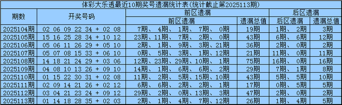 凡哥体彩大乐透第2025114期前区五区遗漏分析:(界说:遗漏0-3期号码为热码,遗漏4-9期号码为温码,遗漏10期及10期以上号码为冷码)