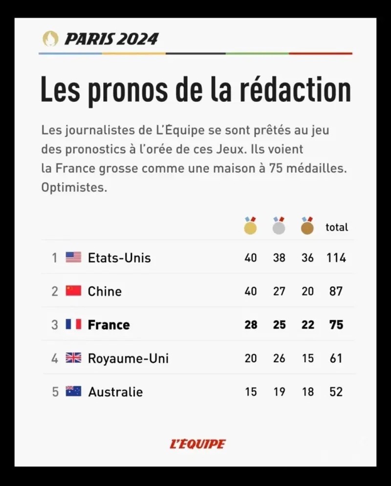 而在法国媒体《队报》的开赛前预测中,他们预测的便是好意思国和中国的金牌数目皆会在40块。此外,中国和澳大利亚的银牌数目以及人法国脉身的铜牌数目也预测对了。